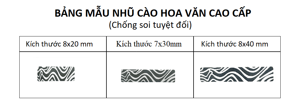 Kích thước nhũ hoa văn cao cấp có 3 size phục vụ cho nhiều kích thước thẻ cào.